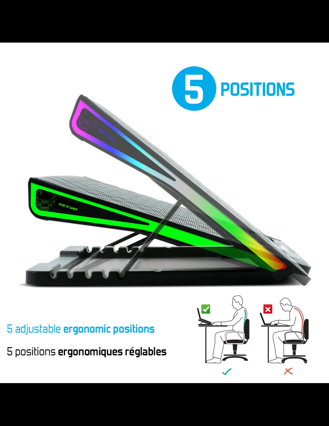 Compatible Avec Les Ordinateurs Portables Jusqu’A 17 Pouces : Airblade 800 Rgb Mesure 40 X 29 X 3.8 Cm. Avec Son Systeme De Ventilation Performant, Airblade 800 Rgb Permet Egalement De Preserver Les Performances Et La Duree De Vie Des Composants Informatiques De Votre Ordinateur Portable.1 Ventilateur De 17 Cm Silencieux Refroidit Rapidement Votre Pc Portable Pour Des Sessions De Jeu Toujours Plus Intensives ! Grace A Son Revetement Micro-Perfore Alveolaire, Airblade 800 Rgb Offre Un Flux D’Air Froid Dynamique Pour Un Refroidissement Maximal. Cote Design Les Barres Led Rgb Integrees Sur Les Cotes Offre Un Style Ultra Gamer. Choisissez Votre Style Parmi 7 Modes Rgb : Rainbow Breathing, Laser, Pixel Ou Flashing Light. Prenez Le Controle : Airblade 800 Rgb Est Equipe D’Un Controleur Lcd. Celui-Ci Vous Permettra D’Allumer Ou D’Eteindre Le Refroidisseur, De Regler La Puissance Des Ventilateurs Avec Ses 6 Vitesses Et De Selectionner Le Mode De Retro-Eclairage Rgb. 2 Ports Usb Pour Un Maximum D’Efficacite : Airblade 800 Rgb Est Alimente Par Votre Ordinateur Portable Via Le Port Usb (5V) : Il Ne Necessite Pas D’Adaptateur Electrique. Un Autre Port Usb Est Inclus Pour Connecter Differents Peripheriques, Comme Une Souris Spirit Of Gamer Par Exemple !Conception Ergonomique Avec 5 Positions Reglables : Airblade 800 Rgb Offre Un Veritable Confort Visuel Et Evite Les Postures Inconfortables Et Douloureuses. Ajustez L’Inclinaison Selon Vos Besoins : 0°, 18°, 28°, 35° Et 40°.