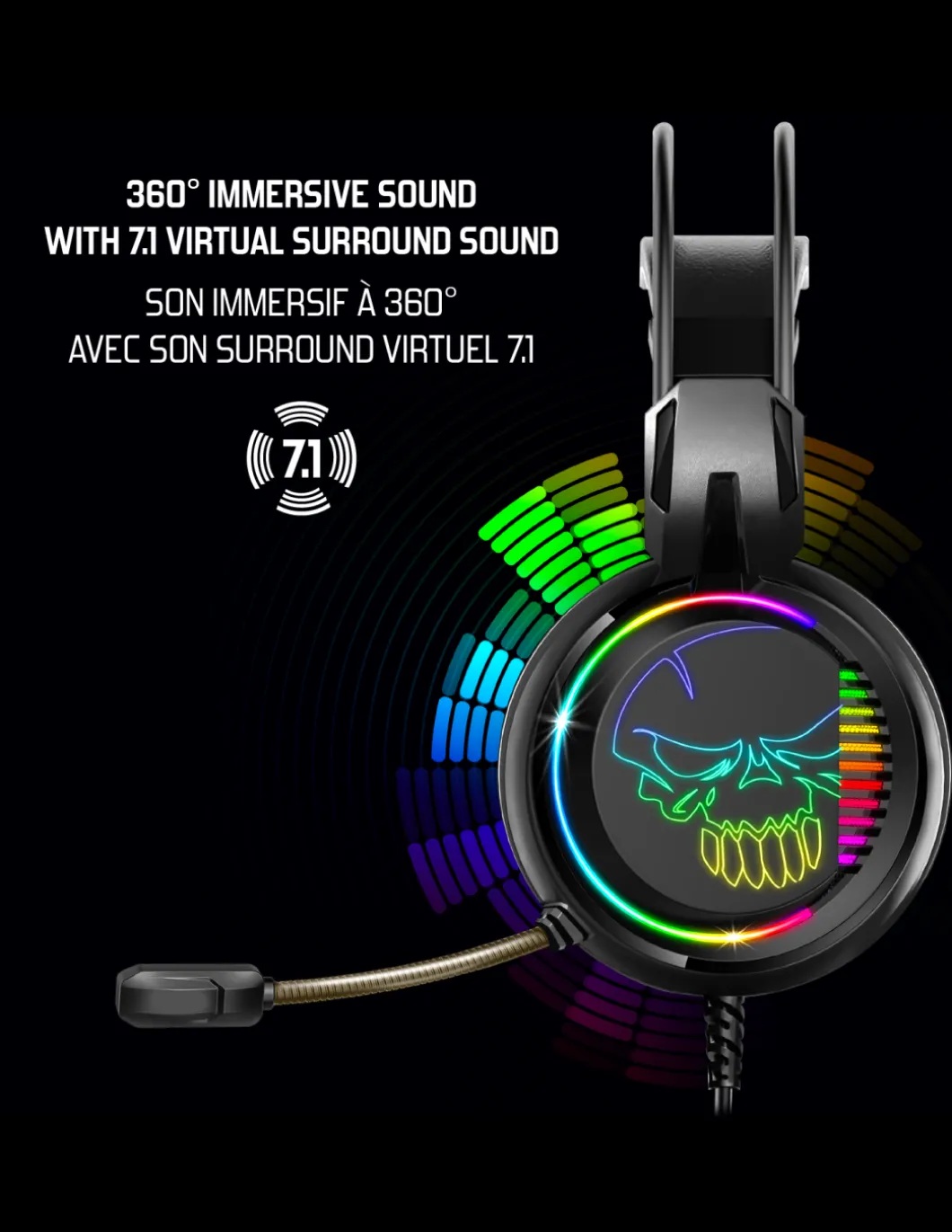 7.1 Virtual Surround Sound : Un Son Ultra Realiste ! Du Sifflement Des Balles De 5.56 Ou A Bord De Votre Amx M4, Profitez D’Une Experience Sonore A 360º Grace A La Technologie 7.1 Virtuel Surround. Un Effet Audio Immersif Qui Vous Permet Plongera Au Coeur De L’Action. Combine Aux Haut-Parleurs De 40 Mm, Il Offre Un Son D’Une Clarte Etonnante Et Des Basses Puissantes. Compatible Pc : Avec Son Cable Usb De 2 Metres, Le Casque Se Branche Directement Sur Votre Pc. Plug And Play, Il S’Installe Automatiquement. Pour Acceder Aux Parametrages 7.1 Virtual Surround, Il Vous Suffira Juste D’Installer Son Logiciel Disponible En Telechargement. Optimisez Votre Experience : Son Microphone Omnidirectionnel A Reduction De Bruit Vous Garantit Des Conversations Clairs Et Precises Avec Vos Coequipiers. Flexible, Vous Pouvez L’Ajuster Rapidement. Sa Telecommande Filaire Permet De Regler Facilement Le Volume Sonore Et De Controler Le Microphone.Retro-Eclairage Rgb : Un Fois Branche, Votre Casque S’Illumine Et Offre Un Retro-Eclairage Rgb Rainbow Ultra-Design De Ses Ecouteurs Et Du Skull Spirit. Un Look Gamer Ultra-Tendance Pour Sublimer Votre Setup!Confort Ultime : La Conception Circum-Aural Des Ecouteurs Englobant Vos Oreilles, La Legerete Des Oreillettes Offrent Une Parfaite Isolation Sonore, Pour Rester Concentre Sur Votre Jeu. Les Coussinets Et L’Arceau Suspendu En Similicuir Sont Rembourres Pour Un Confort Longue Duree.