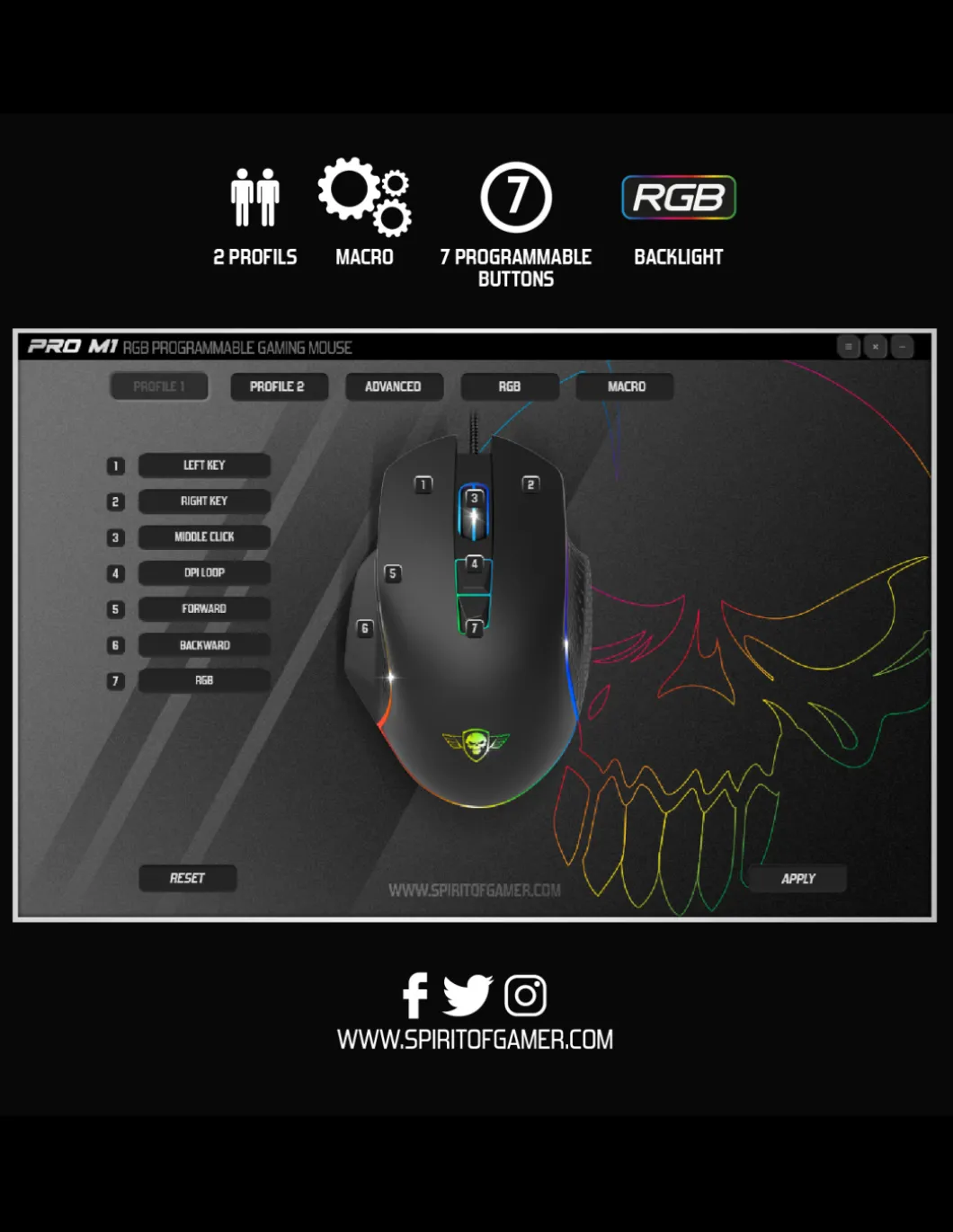 Born To Kill : Mettez Toutes Les Chances De Votre Cote Avec La Souris Pro-M1 Et Son Capteur Optique Sunplus Haute Definition. Sa Resolution Reglable Jusqu’A 8000 Dpi Vous Apportera Une Precision Ideale Et Chirurgical :)Time To : Prom M1 Est Equipee De 7 Boutons Programmables A Configurer Pour Enchainer Les Kill. Vous Pourrez Personnaliser La Souris Selon Vos Envies. La Souris Integre Un Retro-Eclairage Rgb Personnalisable Avec 6 Effets Predefinis.Logiciel Inclus : Veritable Partenaire De Jeu, Pro-M1 Vous Permettra De Creer Jusqu’A 2 Profils Grace A Son Logiciel Dedie. Ce Dernier Vous Permettra De Gerer Les Parametres De La Souris, Des Effets Rgb A La Programmation Des Boutons Avec Son Editeur De Marco. War Machine : Une Petite Machine De Guerre : Acceleration 12 G, Tracking Speed 32 Ips, Polling Rate 125Hz. Son Cable En Nylon Tresse Renforce Longueur 1.5 Metre, Vous Offrira Un Maximum De Fluidite De Mouvement… Ergonomique : Idealement Concu Pour Les Droitiers, La Souris Est Equipe D’Un Repose Pouce Pour Vous Garantir Un Confort D’Utilisation Maximum. Son Revetement Soft Touch Offre Egalement Une Sensation De Confort Supplementaire.